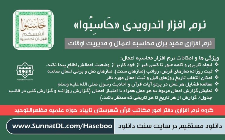 گروه نرم افزاری واحد امور مکاتب حوزه علمیه مظهر العلوم تایباد نرم افزار “حاسبوا” را با هدف محاسبه اعمال مومن طراحی و شما را در این عمل خیر کمک می کنند. شما با این نرم افزار می توانید بسنجید که چقدر اعمال شما نیک بوده و چقدر در امتحان روزمره خود موفق بوده اید. هم اکنون می توانید این نرم افزار مفید و کاربردی را از سایت دانلود دریافت نموده و بعد از نصب در موبایل خود، روزانه از آن استفاده کنید.